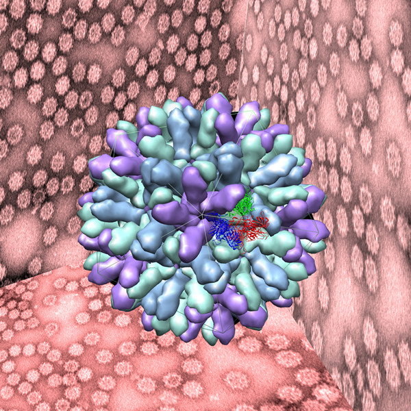 病毒在人们心目中是一个恐怖而神秘的东西,通过电子显微镜人们就可以揭开病毒粒子的神秘面纱。图片中显示的是兔出血症病毒,不要小视这个病毒,一旦它进入兔子体内就会导致兔子因为肝脏坏死而在三天内死亡,它的传播会给养兔业带来极大的危害。图中墙面和地面上镶嵌的就是这个病毒的放大了上百万倍的电子显微镜照片,可以看到这个病毒有着美丽的球形外壳,壳上长满了刺突。科学家们通过这些电子显微镜照片进行计算就获得了图片中央的兔出血症病毒的三维结果模型——是不是像一个美丽的“糖果”?这个“糖果”上的三种颜色代表了该病毒的三个基本组成单元。科学家通过对该三维结构模型的分析就有可以找到防范兔出血症的疫苗。