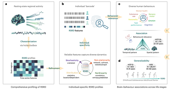 针对这一挑战,中国科学院生物物理研究所李昂研究组联合北京师范大学刘冰研究组,于2025年10月30日在《Nature Human Behaviour》发表题为"Spontaneous brain regional dynamics contribute to generalizable brain-behaviour associations"的研究论文,提出了聚焦脑区内部动态模式的全新分析框架,系统评估了脑区动态属性在解释人脑个体差异及脑-行为关联中的作用与可推广性。研究构建了兼具鲁棒性与个体特异性的脑功能表征框架(Resting-State Regional Dynamics, RSRD),揭示基于RSRD的脑-行为关联模式能在不同生命周期阶段(年龄 8-82岁)中实现独立泛化,为脑功能个体差异研究开辟了全新的方法学路径。
