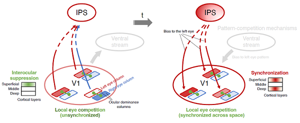 研究发现,双眼竞争起始于初级视觉皮层(V1)眼优势功能柱(ocular dominance columns)表层的侧向抑制,而非丘脑外膝体(LGN)。这一7T fMRI证据解决了清醒猴电生理和传统3T fMRI研究的长期分歧,说明视觉冲突的解决源于早期感觉皮层而非丘脑的抑制性神经环路。研究进一步揭示,虽然受试者无法意识到视觉刺激来自哪只眼睛,来自顶叶注意网络(intraparietal sulcus, IPS)的眼睛特异性的反馈信号能够调节和同步V1功能柱表层和深层的局部竞争,整合形成知觉意识。