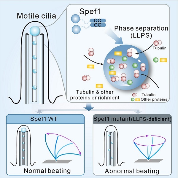 图: Spef1蛋白相分离调控纤毛摆动的工作模型示意图