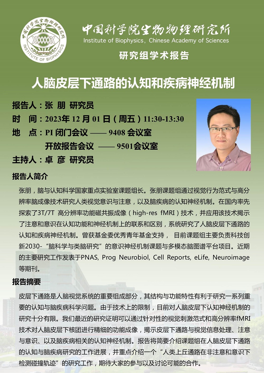 2023年12月1日中午11:30 研究组学术报告:人脑皮层下通路的认知和疾病神经机制