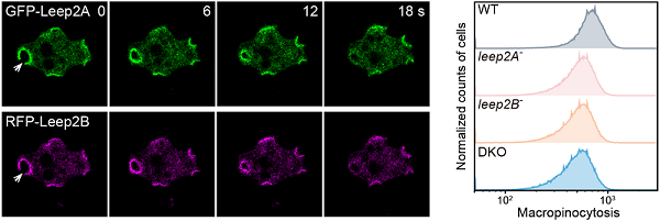在该系统中,研究表明微丝骨架驱动质膜形变,形成环形三维结构 巨胞饮杯。研究组之前的工作建立了通过生化方法筛选在巨胞饮杯定位的调控因子的实验方法。利用这一方法,研究人员鉴定获得了在巨胞饮杯底部高度富集的Leep2A和Leep2B蛋白。研究发现,这两个蛋白构成的异源复合体发挥GTP酶激活蛋白的功能,通过精确调控三个Ras家族小GTP酶的活性,进而调控巨胞饮杯的形成和闭合。