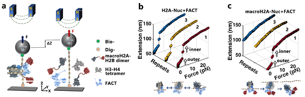图1. 利用磁镊单分子操控技术,精确表征FACT与macroH2A核小体的互作。