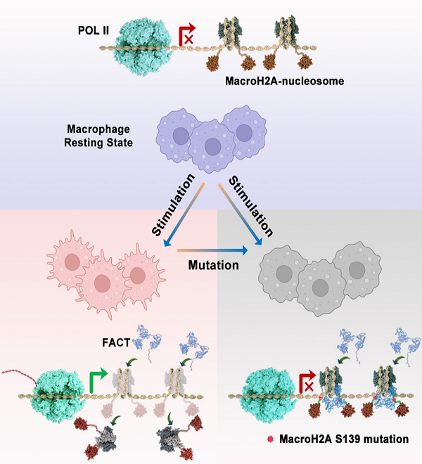 该研究结合多种技术手段,揭示FACT能够介导macroH2A从核小体上清除的重要作用,并最终锁定macroH2A连接区域中第139位丝氨酸是调控FACT复合物与macroH2A相互作用的重要位点。该工作首次从分子水平上明确了FACT复合物与变体macroH2A的互作机制,为深入理解两者互作在基因转录调控中的作用提供理论基础,也为理解macroH2A与FACT在巨噬细胞功能调控中的作用提供了依据。