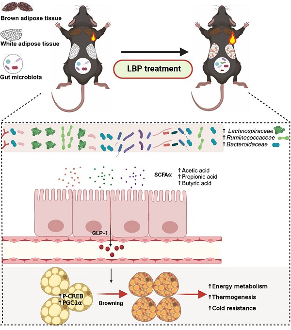 陈畅研究组以C57BL/6小鼠为模型,通过枸杞多糖长期处理,发现枸杞多糖有助于维持冷刺激条件下小鼠的体温,这一效应通过促进白色脂肪组织的棕色化、增加能量消耗和增强产热功能来实现。进一步机制研究发现枸杞多糖的补充增加了小鼠肠道菌群中Bacteroidetes的丰度,并降低了Firmicutes/Bacteroidetes的比例,增加了短链脂肪酸产生菌如Lachnospiraceae、Ruminococcaceae和Bacteroidaceae的丰度和盲肠内容物中短链脂肪酸的水平,令人兴奋的是,肠道GLP-1的释放水平增加,并通过激活iWAT中的CREB/PGC1α信号通路,增加能量消耗而增强产热功能。传统中医古籍记载了多种中药具有"耐寒暑"的功效,但其功效的具体机制缺乏科学证据。该研究首次揭示了中药"耐寒暑"功效的科学内涵,为其它具有"耐寒暑"功效中药的原理解读提供了科学的参照依据,同时枸杞多糖有望成为高寒地区人群的安全膳食补充剂。