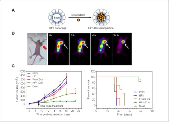 图1:铁蛋白纳米载体靶向输送抗癌药物(A)铁蛋白纳米载体装载抗癌药物;(B)携带抗癌药物的铁蛋白纳米粒精确靶向肿瘤;(C)装载抗癌药物的铁蛋白纳米粒有效治疗结肠癌,延长生存期。