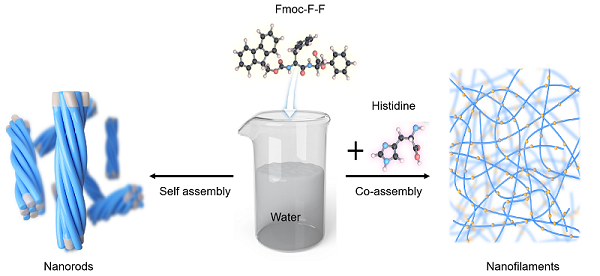 在该项目中,研究人员证明His在Fmoc-F-F二肽的组装中起关键作用,并调控其催化行为,从而为Aβ1-42催化和AD发病机制之间提供了联系。与大多数FF组装是在有机溶剂(如二甲基亚砜(DMSO)、六氟异丙醇(HFIP))中进行的研究不同,该项目证明了氨基酸,特别是His水溶液的存在下,可以将Fmoc-F-F从纳米棒转变成纤维丝(图1)。
