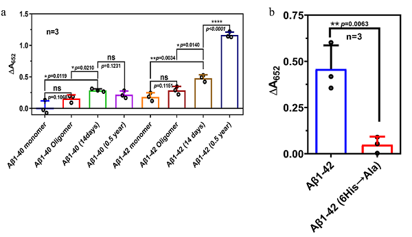 图2 Aβ1-42催化活性。a Aβ的POD活性。b Aβ1-42突变体的POD活性。