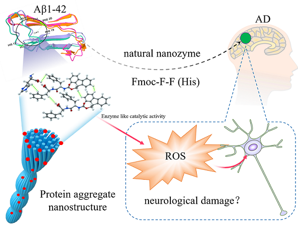 Aβ1-42的19,20号位氨基酸FF作为其组装核心基序,被广泛研究并被报道可形成β结构的超分子纳米结构,因此受到广泛关注。研究FF的自组装行为可以更好地揭示Aβ1-42的聚集发生过程。但FF与Aβ1-42的组装行为不完全相同,因为Aβ1-42中的其他氨基酸也会影响自组装。氨基酸残基,如芳香基、氨基或羧基,可以通过π-π堆积力和其他相互作用(如氢键和范德华力)驱动并影响FF的组装。在20种天然氨基酸中,组氨酸(His)在蛋白质的相互作用中发挥多种作用,并可作为参与酶催化的关键残基。His作为中性形式的芳香π(His)或质子化形式的阳离子(His+)可以与其他芳香氨基酸进行π-π堆叠及H-π作用。His还可以与金属配合调节酶的催化作用。例如,His170与血红素中心的铁配位,以调节辣根过氧化物酶的催化作用。His可以用作修饰或自组装成人工酶的关键单元,以模拟过氧化物酶(POD)样或过氧化氢酶(CAT)样活性。因此,His不仅可以调节FF自组装的纳米结构,还可赋予组装体特定的生物活性。Aβ1-42的6,13,14号位均为His,这为其和19,20FF的相互作用提供了可能。同时,FF和His的相互作用也可能会构成酶的催化活性位点,使得Aβ1-42具有纳米酶的活性从而造成氧化损伤。