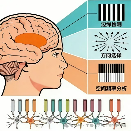初级视觉皮层位于大脑后部的枕叶,是大脑处理视觉信息的"关键一站",堪称大脑视觉世界的"核心解码器",负责解码物体的轮廓、形状、颜色等特征,是所有高级视觉认知的基础[6]。但它并非简单地传递信息碎片,在视觉皮层中,相邻的、具有相似功能偏好的神经元会协同工作[7],通过神经元网络的协同配合,视觉皮层可以将简单的线条和边缘组合成更复杂的图形元素,为识别完整的物体信息奠定了基础。