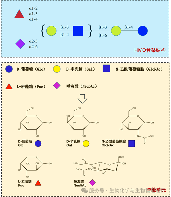 HMOs的重要生物活性是由其特殊结构决定的,组成HMOs的单糖单元有葡萄糖(Glc)、半乳糖(Gal)、乙酰葡萄糖胺(GlcNAc)、岩藻糖(Fuc)、N-乙酰基神经氨酸(唾液酸,NeuAc)五种。HMOs的主链由葡萄糖、半乳糖和乙酰葡萄糖胺组成,在主骨架上发生不同程度的岩藻糖基化或唾液酸化。