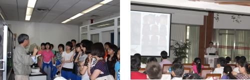 在图书馆报告厅,孙飞研究员、张鹏副研究员分别作了题目为 “认识生物大分子”、“模式生物果蝇在疾病研究中的应用”的科普讲座。孙飞研究员利用三维动画电影等新媒体手段立体、形象、细致浅出地为同学们介绍了什么是生物大分子。张鹏在报告中融入生活和现代流行元素,图文并茂地为公众们介绍了果蝇模式动物在科研中的重要作用。两个精彩报告使公众在故事性和趣味性的讲座中深入认识了生命科学。