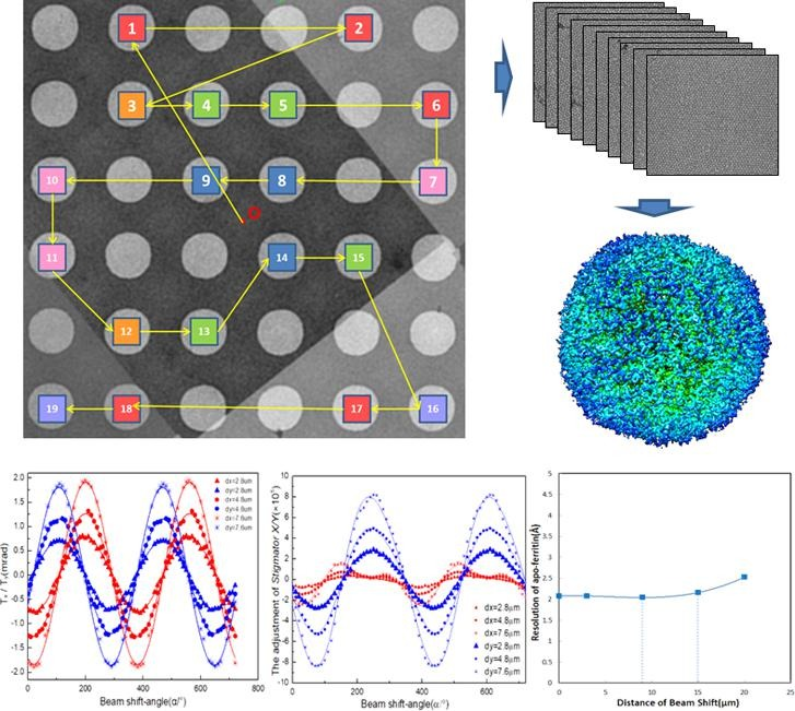 上图以一个测试范例说明了使用电子束偏移可实现的转换数据拍摄视野的范围和拍摄顺序,表明该方法可实现孔间的数据收集自由定位拍摄,且不局限与孔的排列和尺寸。下图从左至右分别展示了物镜像散和慧差的变化与电子束偏移的角度和幅度之间的关系,以及铁蛋白在不同的电子束偏移幅度下收集的数据可获得的分辨率情况。
