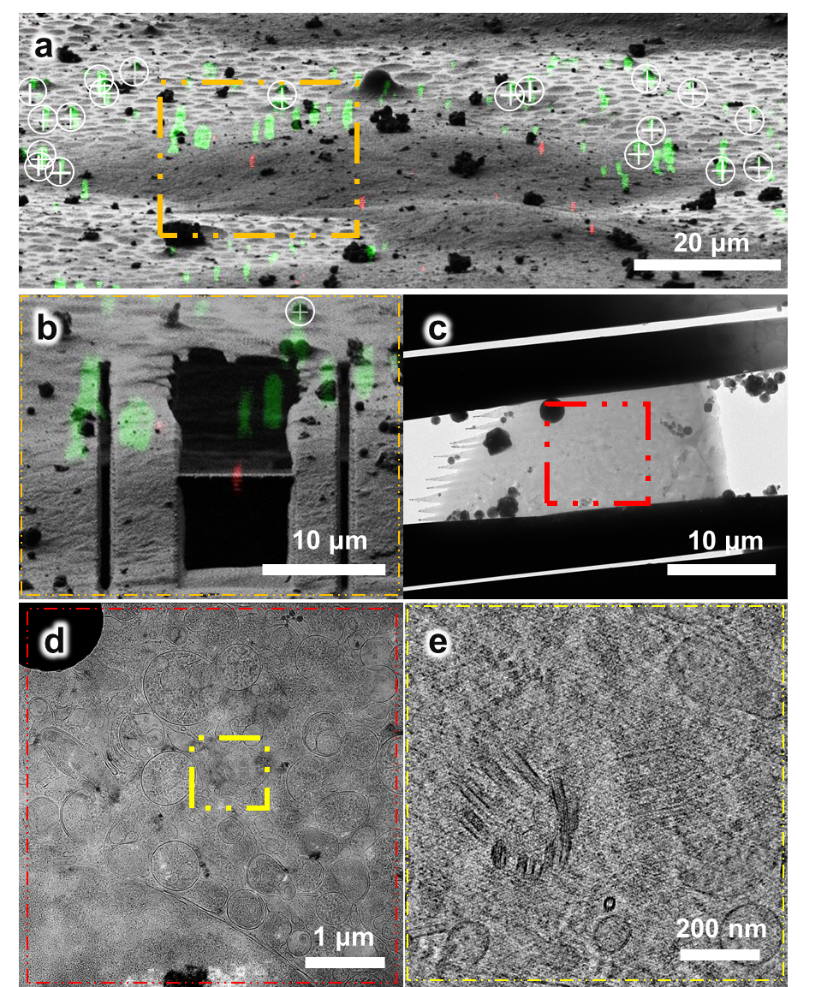 a.3D-View光-电关联软件获得的冷冻结构光-cryo-FIB关联配准图;b.cryo-FIB对红色荧光标记所在区域进行减薄;c.cryo-FIB减薄获得的200nm冷冻含水切片;d.冷冻含水切片在透射电镜下8700倍成像,黄色框线内为目标中心体;e.目标中心体的cryo-ET数据采集(53000倍)激光指向位置主动稳定系统示意图。