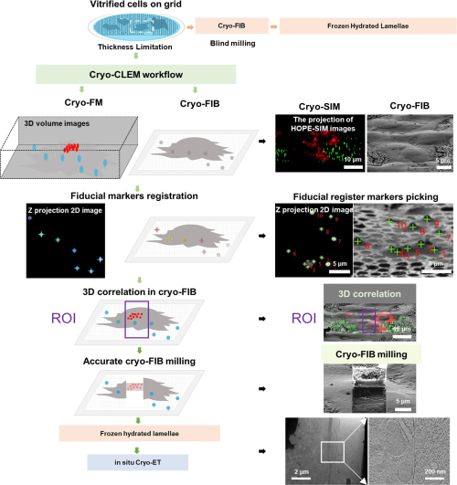 Cryo-focused ion beam (cryo-FIB) milling technology has been developed for the fabrication of cryo-lamella of frozen native specimens for study by in situ cryo-electron tomography (cryo-ET). However, the precision of the target of interest is still one of the major bottlenecks limiting application. Here, we have developed a cryo-correlative light and electron microscopy (cryo-CLEM) system named HOPE-SIM by incorporating a 3D structured illumination fluorescence microscopy (SIM) system and an upgraded high-vacuum stage to achieve efficiently targeted cryo-FIB. With the 3D super resolution of cryo-SIM as well as our cryo-CLEM software, 3D-View, the correlation precision of targeting region of interest can reach to 110 nm enough for the subsequent cryo-lamella fabrication. We have successfully utilized the HOPE-SIM system to prepare cryo-lamellae targeting mitochondria, centrosomes of HeLa cells and herpesvirus assembly compartment of infected BHK-21 cells, which suggests the high potency of the HOPE-SIM system for future in situ cryo-ET workflows.