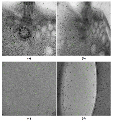Successful detection and tracking of gold beads from the tilt series of micrographs. (a) and (b) The plastic embedded specimen with (a) for the low tilt and (b) for the high tilt. (c) and (d) Cryo-vitrified specimen (KHL) with (c) for the low tilt and (d) for the high tilt.