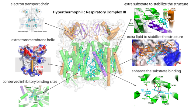 In this work, we solved the 3.3 ? resolution structure of respiratory chain complex III from A. aeolicus in both natural state and inhibited state, using cryo-EM single particles analysis. It’s the first high-resolution three-dimensional structure of respiratory chain complex III from thermophilic species. By sequence alignment and structural analysis, we identified a series of novel structural characteristic to significantly enhance the stability of the protein complex, and found a number of special residues with an extra transmembrane helix in thermophiles to stabilize the ligands and subunits. Moreover, the complex III has hold an extra quinone and phospholipid molecules inside the protein, which further enhance the stability of the protein complex on the cell membrane. These finding reveals the structural basis of complex to remain stable in extreme environment, and provides theoretical basis and experimental data for future study of other proteins’ stability in extreme environment.