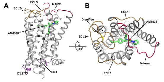 图二,A: 人源大麻素受体(CB1)与拮抗剂AM6538复合物结构的侧视图。CB1的结构以灰色卡通图表示,拮抗剂AM6538以绿色棍状模型表示。B: 人源大麻素受体(CB1)与拮抗剂AM6538复合物结构的俯视图。