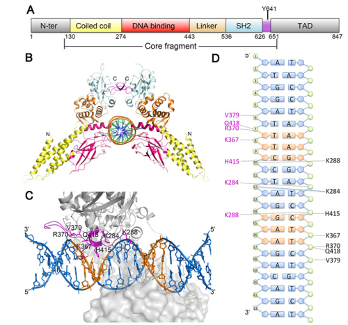 图示:STAT6核心片段在全长中所在的区域及STAT6核心片段与N4位点DNA复合物结构。