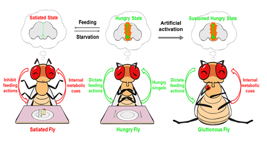 朱岩研究组经过长期探索,在果蝇的脑中鉴定出一簇与进食行为直接相关的神经元,将其命名为Taotie(饕餮)神经元。利用遗传学的手段快速地激活这群神经元唤起饱食果蝇的进食欲望并引发强烈的进食行为,仿佛果蝇又进入了饥饿状态。反之,在饥饿的果蝇中抑制Taotie神经元活性显著降低其进食欲望和食物的摄入量。利用光遗传学的手段持续长期地激活Taotie神经元时,果蝇“脑管不住嘴”,引起体脂和体重增加等一系列类似肥胖症的表型。而且肥胖程度直接与Taotie神经元所受的刺激强度呈正相关。这些结果显示出Taotie神经元的活性对体内能量稳态尤其是稳态平衡点的确定起着决定性的作用。为了在生理层面更直接地获得Taotie神经元的活性和机体内在生理状态之间的联系,研究人员通过神经元活动成像实验发现,Taotie神经元的活性受到体内血糖水平的调控,而且Taotie神经元的活性直接反映出动物自身的饥饿状态。此外,该研究同时还发现激活Taotie神经元能够拮抗饱食信号,并直接控制类胰岛素肽(胰岛素在果蝇中的同源物)的分泌。