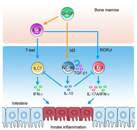 2017年8月24日,国际权威期刊Cell杂志在线发表了范祖森课题组在肠道炎症致病机制研究中的重要研究进展,该项创新研究成果的标题为:“Regulatory innate lymphoid cells control innate intestinal inflammation”。天然免疫系统是机体抵抗病原体的重要防线。天然免疫系统需要精确的免疫平衡调节,免疫应答低下或者应答过度均会引起免疫平衡失调,导致严重的免疫病理反应。肠道粘膜免疫系统是机体抵抗病原体的重要场所之一。然而,肠道粘膜免疫系统同时也对不同的共生菌和食物来源的抗原产生免疫耐受。肠道免疫系统的活化和免疫耐受的失衡会导致炎性肠道疾病的发生。固有淋巴样细胞(ILC)是近年来发现的一类重要的天然免疫细胞亚群。根据ILC细胞分泌细胞因子的不同可以分为三类,即ILC1、ILC2和ILC3细胞。不同类群的ILC细胞在抵抗病原体反应中均发挥着重要的作用。ILC细胞在病原体刺激后被激活产生大量的细胞因子,如TNF、IFN-?和IL-17等,激发免疫应答以清除病原体。有研究表明,肠道中的ILC细胞的过度活化会导致肠道炎症,而持续的炎症会引起炎性肠道疾病(IBD)。因此,是否存在调节性的ILC细胞一直是天然免疫研究领域重点关注的课题。