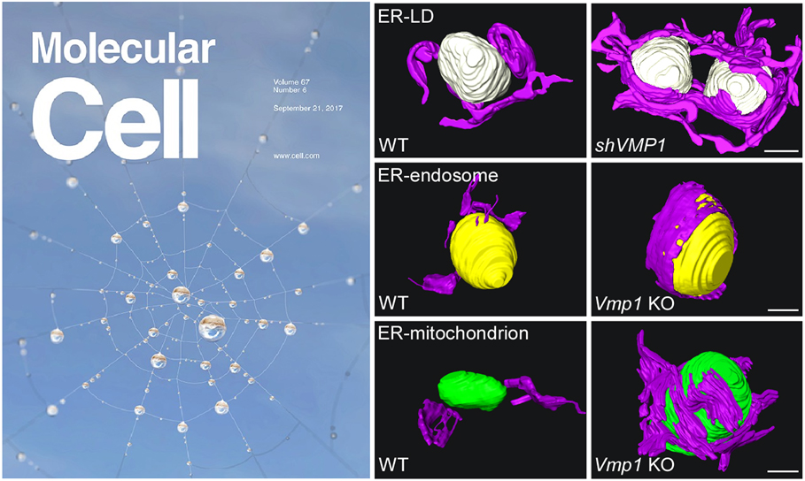 2017年9月21日,《Molecular Cell》杂志以封面文章发表了张宏课题组的研究论文“The ER-localized transmembrane protein EPG-3/VMP1 regulates SERCA activity to control ER-isolation membrane contacts for autophagosome formation”, 该文阐述了课题组前期研究发现的多细胞生物特有的自噬蛋白EPG-3/VMP1参与内质网(ER)调控自噬小体形成过程的机制。