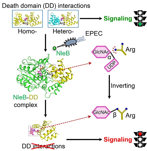 肠致病性大肠杆菌EPEC是一种重要的病原菌,通过感染肠上皮细胞,引起腹泻、肠炎等肠道疾病,严重危害人类健康。2013年邵峰研究组发现,EPEC通过分泌特异的三型分泌系统效应蛋白NleB阻断宿主死亡受体信号通路,帮助病原菌在宿主肠道内定植和感染。进一步生化研究表明,NleB具有糖基转移酶活性,能够特异地糖基化修饰(N-乙酰葡萄糖氨基修饰,GlcNAcylation)宿主死亡受体信号通路中死亡结构域上的一个关键精氨酸,从而阻断死亡结构域的相互作用和胞内信号复合体的组装,而发生在精氨酸上的GlcNAcylation不同于宿主细胞内常见的各种糖基化修饰,是一种新颖的蛋白质翻译后修饰。但是NleB如何特异地识别宿主靶蛋白死亡结构域,又是如何催化新颖的精氨酸GlcNAcylation来阻断宿主死亡受体信号通路的分子机制完全不清楚。