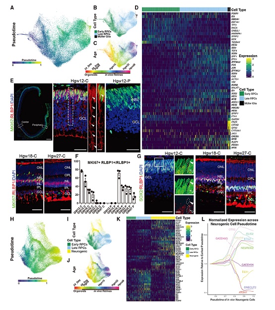 2020年5月7日,Developmental Cell杂志在线发表了题为“Single-cell analysis of human retina identifies evolutionarily conserved and species-specific mechanisms controlling development”的研究论文。该工作通过对16个时间点的人胚胎视网膜和4个发育阶段的人视网膜类器官进行高通量单细胞测序,建立了人类视网膜发育的转录组数据库,阐述了视网膜在发育过程中各种细胞类型命运决定以及黄斑形成的分子调控机制,并通过跨物种分析,揭示了人与小鼠的视网膜在发育过程中的进化保守性以及物种特异性。