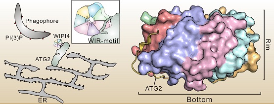 自噬是真核细胞中一种高度保守的自身降解途径。自噬过程通过细胞内容物的降解和循环利用,在维持细胞内稳态平衡、避免有害蛋白聚集体积累以及抵御病原入侵等方面都发挥着重要作用。WIPI蛋白家族是自噬起始信号PI3P脂质的效应分子,其可以招募其他因子对自噬体形成进行调控。WIPI家族蛋白可以特异性识别ATG2蛋白中的一段线性序列(WIR-Motif)形成WIPI/ATG2复合物,定位到吞噬泡和内质网的交界处,促进自噬体的延伸与闭合。然而,两者之间的识别模式及其调控自噬体形成的机制却不清楚。
