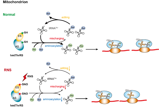 图:RNS介导的亚硝基化修饰对于线粒体ThrRS活力的调节作用示意图