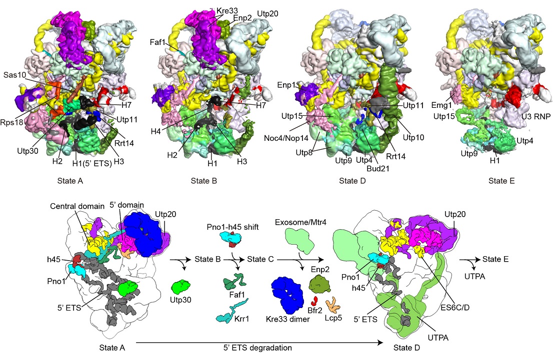 核糖体是所有生物用来合成蛋白质的分子机器,是生命的基本元件。核糖体包括大亚基和小亚基,两个亚基都是由核糖体RNA和大量蛋白质构成的大型复合物。在真核细胞中,核糖体的组装是一个高度复杂、动态的过程,两个亚基在成熟过程中会结合大量的组装因子,形成一系列核糖体前体复合物。小亚基在成熟过程中形成两种主要的前体:位于细胞核仁区的早期前体和位于细胞质的晚期前体。最近研究已经解析了小亚基早期和晚期前体的结构,发现它们的成分和结构存在巨大的差别,但目前不清楚早期前体是如何转变到晚期前体的。