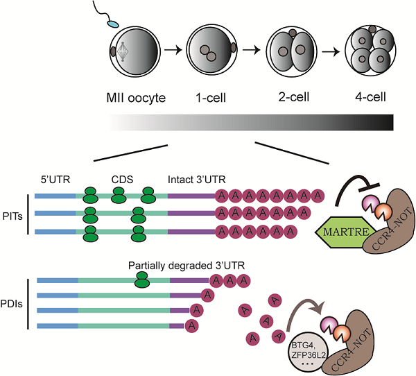 哺乳动物胚胎发育早期缺少显著的基因转录活性,蛋白质合成所需的mRNA模板主要由卵子储备的母源mRNA提供。母源mRNA在卵子向胚胎转换(oocyte to embryo transition, OET)过程中,mRNA的poly(A)尾长度与其翻译活性高度偶联,poly(A)的长度调控是早期胚胎实现选择性蛋白翻译的重要机制。然而,母源mRNA poly(A)尾长短的决定与维持机制均不明确。