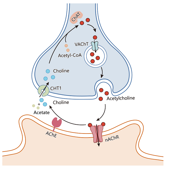图1:胆碱能神经元中乙酰胆碱的循环及信号传递过程。