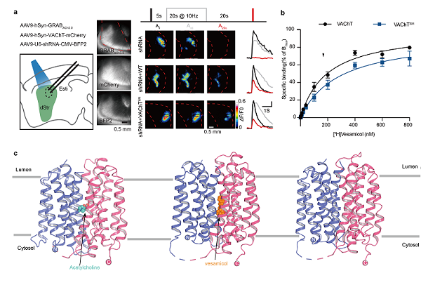 VAChT属于质子/溶质逆向转运蛋白家族,在质子电化学势的驱动下完成底物乙酰胆碱的跨膜转运。研究团队分别解析无底物及乙酰胆碱结合的囊泡开口结构(见图2c),同时鉴定出独特的质子传递网络。乙酰胆碱结合在VAChT中央口袋中,通过与结合口袋周围关键氨基酸形成大量氢键和静电相互作用,从而实现特异性的结合与转运。为了深入理解这些相互作用对转运功能的影响,研究团队将与乙酰胆碱及质子结合密切相关的关键氨基酸进行了突变,并在小鼠大脑背侧纹状体内对胆碱能神经元释放乙酰胆碱的功能进行了研究(见图2a)。纹状体内乙酰胆碱的释放对包括运动控制、决策行为、学习和记忆在内的多种生理功能具有重要调节作用。我们发现相关的突变会直接影响乙酰胆碱在纹状体中的释放,直观地阐释了质子结合、底物转运与生理功能之间的关系,为理解VAChT在乙酰胆碱转运、储存和释放中的作用提供了重要见解。