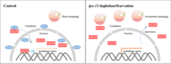 综上,该研究发现转录因子LIN-15B是调控线虫发育过程中自噬活性的关键因子,且LIN-15B的调控功能依赖于核转运蛋白IPO-13将其从细胞质运输到细胞核中,并且这一过程受营养状态调控。