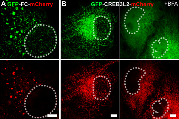 图2 GFP-FC-mCherry融合蛋白(A)和GFP-CREB3L2-mCherry(B)的Multi-SIM图像。比例尺,5 µm