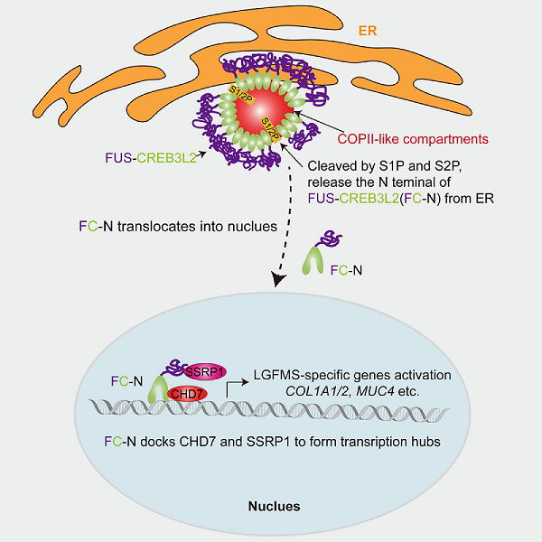 在细胞核内,FC-N特异性募集SSRP1和CHD7形成转录复合物,激活LGFMS特征性基因表达,最终诱导细胞获得恶性表型(图3)。该研究首次阐明FC异常相分离导致的ER膜重塑如何传递至细胞核的调控路径,为开发靶向LGFMS的治疗策略提供了重要理论依据。