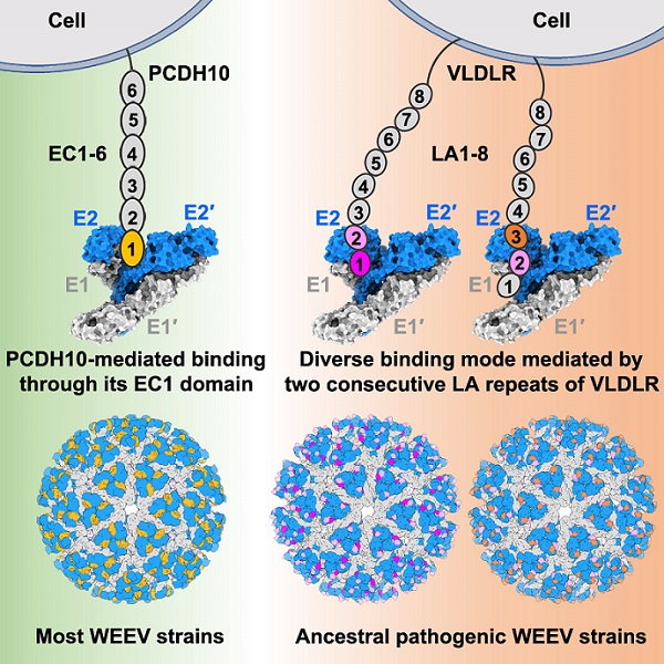 2025年5月20日,中国科学院生物物理研究所章新政课题组与清华大学基础医学院向烨课题组合作在《Cell Reports》杂志在线发表了题为"Structural basis for the recognition of two different types of receptors by Western equine encephalitis virus"的研究论文。该研究系统性地解析了WEEV不同毒株分别与受体PCDH10和VLDLR的高分辨率冷冻电镜结构,发现这两种受体在WEEV病毒表面形成了完全不同的结合界面和识别模式(图1),阐明了病毒发生受体转换的结构基础和分子机制,并为甲病毒防控提供了重要的理论依据。