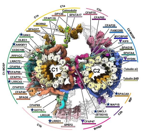 受精卵是生命起点,而精子能否“长途跋涉”并成功与卵子相遇,是这一生命奇迹诞生的先决条件。不孕不育困扰着全世界约1/6的育龄夫妇,是全球重大医学难题。弱精症是男性不育最常见的原因之一,表现为精子运动能力缺陷。精子鞭毛具有标志性的“9+2”轴丝结构,由9组微管二联体围绕中央微管(Central Apparatus,CA)组成,通过动力蛋白臂引起轴丝微管相互之间滑动,促使精子鞭毛摆动,进而产生精子游动。目前,哺乳动物精子鞭毛轴丝中央微管的精细结构和功能机制仍不清楚,制约了对弱精症发病分子机理的科学阐释。