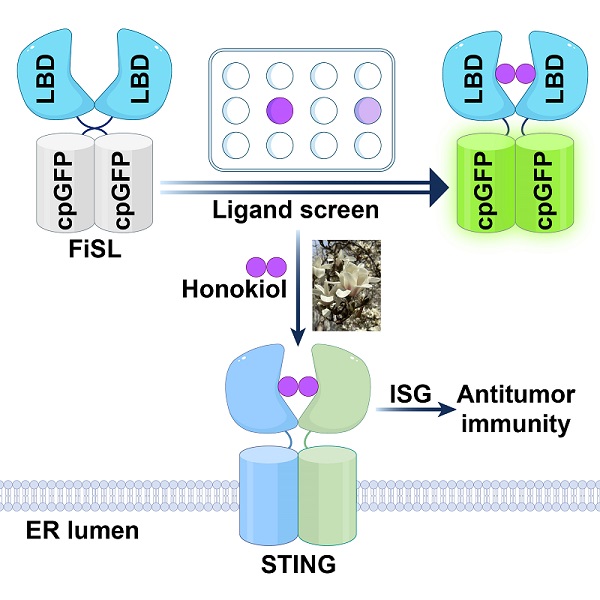 2025年7月15日,中国科学院生物物理研究所李新建研究团队在《Cell Reports Methods》杂志上在线发表了题为"A fluorescent STING ligand sensor for high-throughput screening of compounds that can enhance tumor immunotherapy"的研究论文。该工作研发了一款可用于高通量筛选STING配体的荧光探针,并将其命名为FiSL (Fluorescence Indicator for STING Ligand)。以FiSL探针作为工具,研究人员筛选出小分子化合物和厚朴酚是STING的激动剂。据东汉医圣张仲景所著《金匮要略》记载,和厚朴酚是中医药方半夏厚朴汤中的有效成分,具有降逆化痰、行气开郁的功效。动物实验结果显示,和厚朴酚可通过口服方式快速递送至肿瘤组织,激活抗肿瘤免疫,有效延长多种实体瘤(包括结直肠癌、黑色素瘤和乳腺癌等)荷瘤小鼠的生存期并无明显的毒副作用。综上,该研究搭建了STING小分子激动剂的高通量筛选平台,在此基础上筛选发现中药活性成分和厚朴酚是STING小分子激动剂,并利用小鼠肿瘤模型证实和厚朴酚具有显著抗肿瘤效果和低毒副作用。因此,该研究有望给肿瘤患者提供新型的免疫治疗方案、为中医药的现代化开辟新思路。
