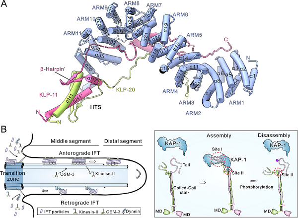 图. 驱动蛋白kinesin-2异源三聚体尾部区域的整体结构及其参与纤毛内物质运输调控的模式图