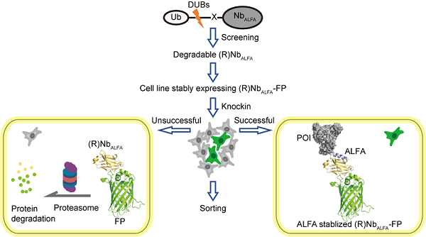 纳米抗体作为最小的功能性抗体片段,具有体积小(约15 kDa)、稳定性高和亲和力强等优势。荧光蛋白与纳米抗体融合形成的"荧光纳米抗体"(chromobody)不仅能实现多色活细胞标记,还可用于超分辨成像和蛋白质动态研究。然而,传统荧光纳米抗体需要针对每个目标蛋白单独开发,耗时费力。针对这一瓶颈,团队人员将目光转向通用型标记系统。ALFA标签是一种仅含13个氨基酸的理性设计标签,其稳定的α-螺旋结构使其体积小于大多数线性表位标签,且具有优异的化学稳定性。团队发现,与ALFA标签特异性结合的高亲和力纳米抗体NbALFA的稳定性依赖于ALFA标签的存在:在没有ALFA肽段时,NbALFA可部分被降解;而当细胞内ALFA标签水平升高时,NbALFA信号会相应增强。