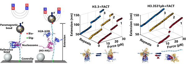 图1. 利用高分辨磁镊单分子操控技术,精确表征FACT与H3.3核小体的互作。