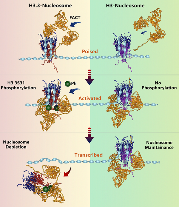 图2. H3.3S31磷酸化可充当分子开关,调控核小体从稳定状态向活化状态的动态转变。