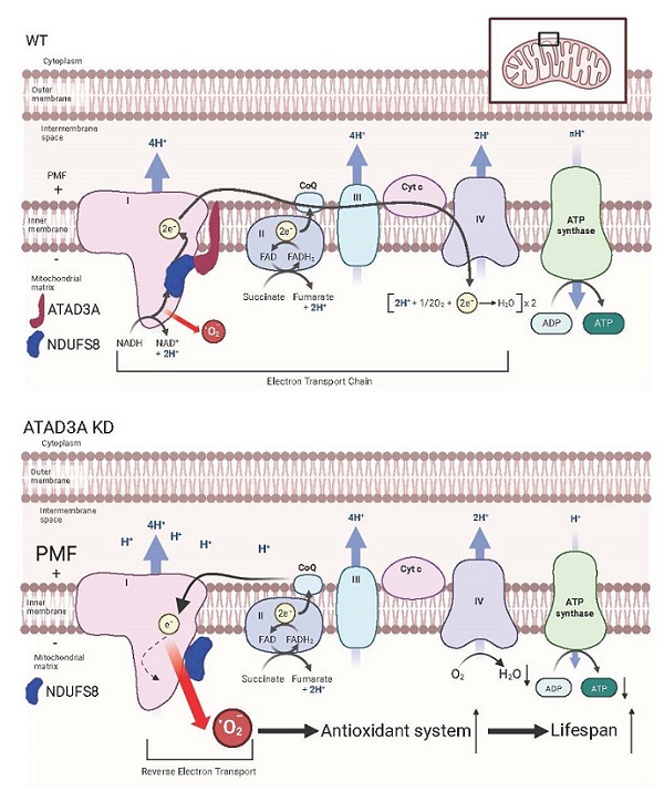 研究者利用线粒体氧化还原敏感的mt-Grx1-roGFP2探针转基因线虫完成了高通量全基因组RNAi筛选。发现特异性敲低候选基因atad-3(ATAD3A)可显著增加线虫和哺乳动物细胞中线粒体ROS的水平,提示ATAD3A在介导线粒体氧化还原调控中的重要功能。机制研究发现ATAD3A与线粒体复合体I亚基NDUFS8相互作用,在复合体I的组装和活性中发挥重要功能。敲低ATAD3A会降低复合体I的活性和质子泄漏,增加线粒体膜电势,从而诱导反向电子传递(RET)产生更多ROS。诱导的RET-ROS作为线粒体功能受损的保护性反应,激活抗氧化系统,增强线虫的抗逆性并延长寿命。