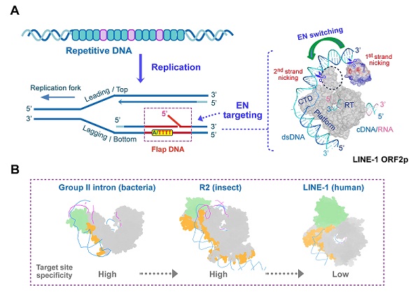 图2:LINE-1逆转座酶靶向切割DNA的分子机制。(A)LINE-1靶向识别复制过程中特殊分叉状DNA,并通过EN构象变化实现双链切割。(B)从低等到高等生物的逆转座酶结构对比图。