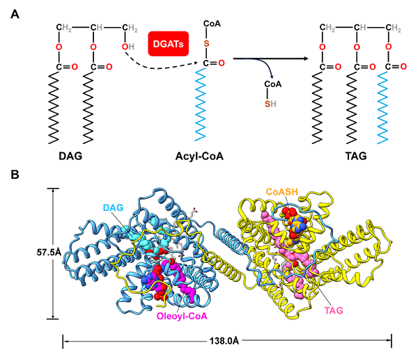 甘油三酯(TAG)是植物油脂的主要成分,其与食品及生物柴油等的生产密切相关。二酰基甘油O-酰基转移酶1(DGAT1)是甘油三酯生物合成过程中的限速酶,催化二酰基甘油(DAG)和脂酰辅酶A(Acyl-CoA)生成甘油三酯和辅酶A(CoASH)。DGAT1是基因工程改造植物以提高油脂产量和改善油脂品质的重要靶点。此外,DGAT1在植物应对非生物胁迫中也发挥重要作用。虽然人源DGAT1的三维结构已经得到解析,但是植物DGAT1的结构及其催化甘油三脂合成和活性调控的分子机制尚不清楚。