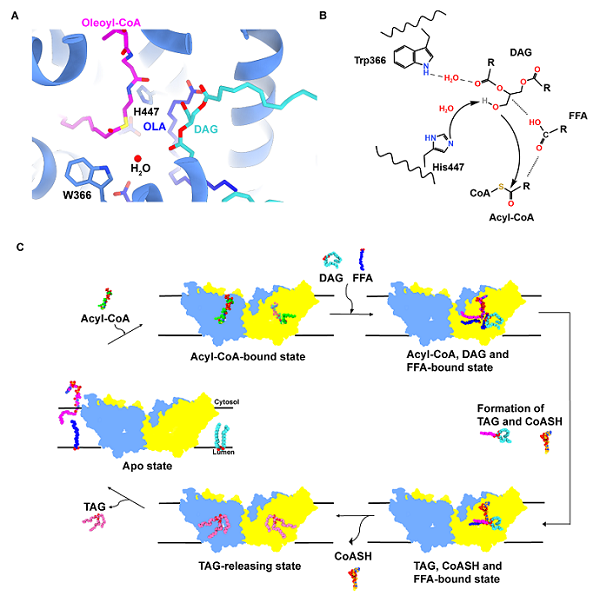 图2. DGAT1催化循环模式图。(A)AtDGAT1活性位点的关键氨基酸与两个底物分子的分布图。该模型是基于AtDGAT1-H447A的冷冻电镜结构生成,其中将Ala447变为His并对周围配体进行微调以避免发生冲突。(B)His447和FFA参与的AtDGAT1催化机制模型。(C)植物DGAT1的催化循环模式图。