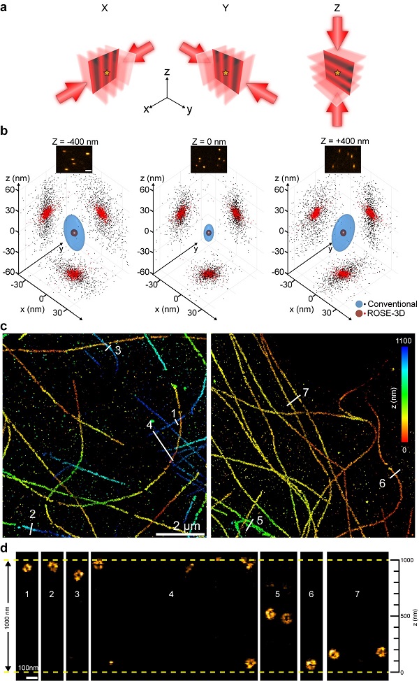 这是该团队在发展的干涉定位显微镜ROSE(Nature Methods 2019)和ROSE-Z(Nature Methods 2021)基础上,在干涉定位显微镜领域的又一新突破。通过设计基于光电偏转器的高速切换照明光路,ROSE-3D成功在X、Y、Z三个方向同时引入干涉光,并实现了小于1微秒的干涉条纹切换时间。