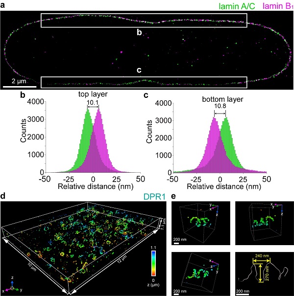 该工作还拓展了ROSE-3D的多色与多层成像功能,实现了对COS-7细胞中核纤层蛋白lamin A/C与lamin B1的双色成像。统计分析显示,lamin A/C分布于lamin B1内侧,两者间距约10纳米,这是首次从三维全细胞核尺度揭示该分布的特征。此外,利用三维各向同性纳米分辨能力,研究团队还捕捉到了线粒体分裂关键蛋白DPR1组成的复合体在线粒体外膜组装成螺旋状、环状等多种形态,这也是首次在原位实现对该蛋白复合物的结构解析。